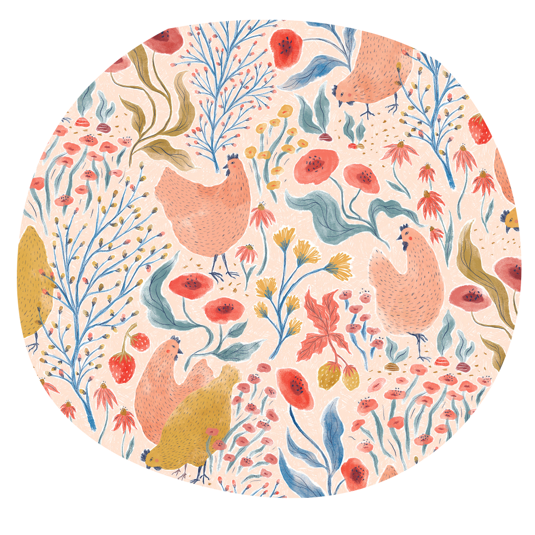 Ginger has a creamy background with peach and golden hens exploring a fantastical garden world with poppies, strawberries, and more. Each hen is filled with personality, capturing the cheeky looks and charm as they peck and dig and explore.