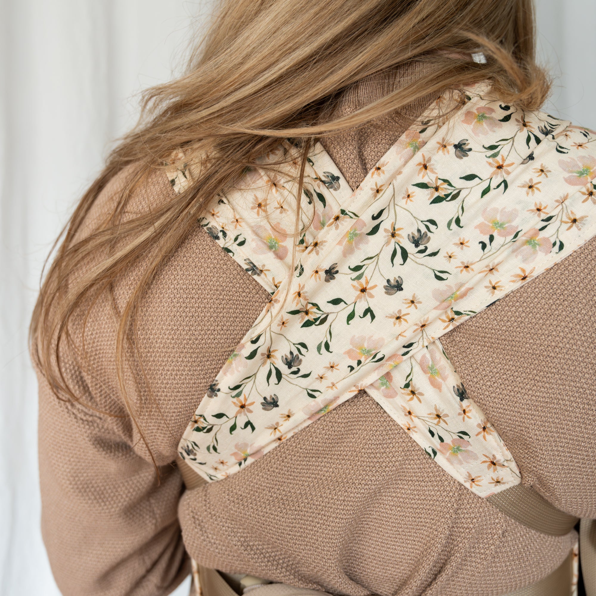 The Sprout uses an apron-style design with flexible, soft, and wide straps that mold to your body, avoiding pressure points and distributing your baby's weight evenly across your upper back and shoulders. The straps work with your body instead of against it, creating a soft, comfortable fit that allows for long babywearing sessions.